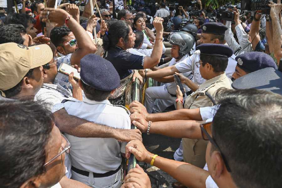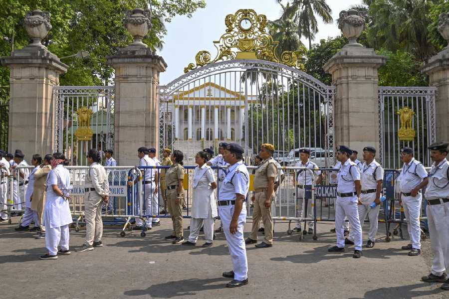 Security personnel stand guard during Trinamul Congress Education Wing's protest against West Bengal Governor C V Ananda Bose over molestation allegations, in Calcutta.