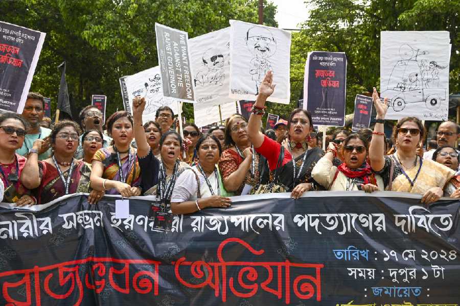 The Trinamul Congress demonstrated near Raj Bhavan in Calcutta over the allegation of molestation against West Bengal Governor C V Ananda Bose, demanding his resignation. The protestors, who included members of the TMC affiliated West Bengal College and University Professors Association (WBCUPA), held placards and shouted slogans, as the police stopped them from advancing towards the Governor's House.
