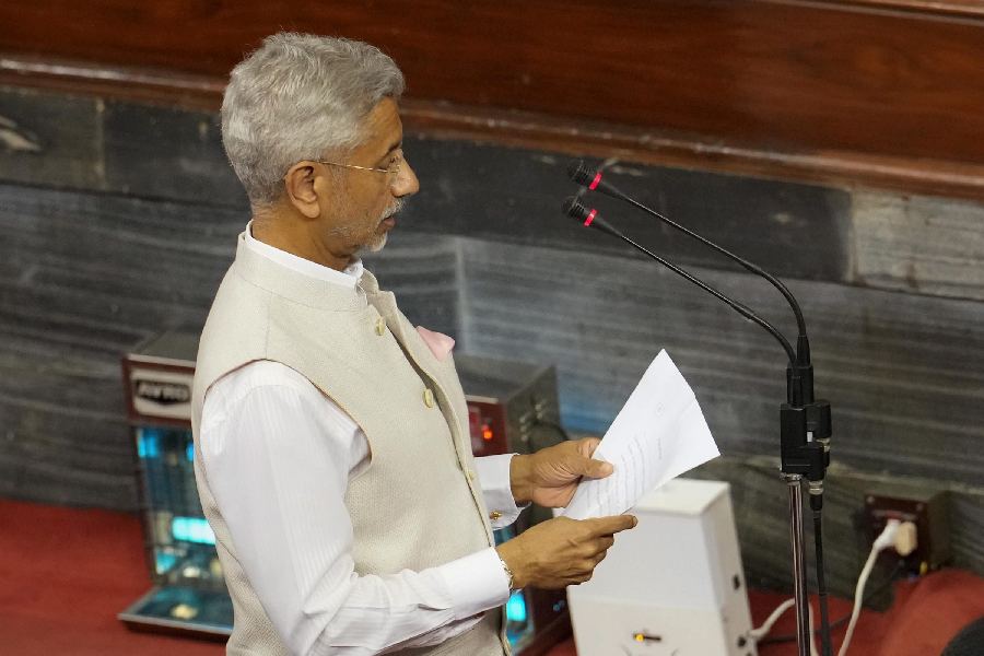 The image shows prominent BJP leader and External Affairs Minister, S. Jaishankar, as he takes the oath as a Rajya Sabha MP. This event marks the centrepiece of the induction ceremony for the nine MPs, each a representative of their constituencies.