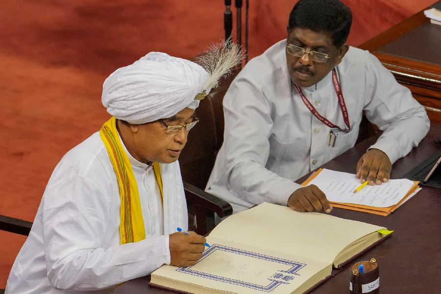 BJP leader Nagendra Ray ceremoniously signs an official document following his oath-taking as a Rajya Sabha MP. Amidst the dignified surroundings, Mr. Ray's signature signifies his unwavering commitment to the responsibilities entrusted to him by his constituents.