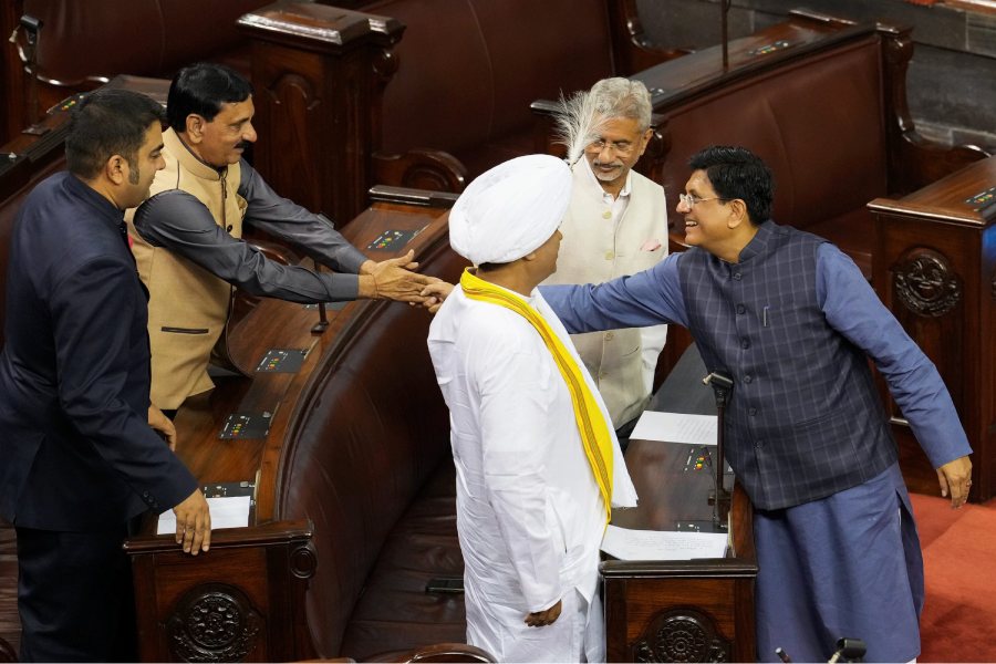 Union Minister Piyush Goyal extends a warm welcome to BJP leader Babubhai Jesangbhai Desai, moments after the latter's oath-taking as a Rajya Sabha MP. Goyal's outstretched hand symbolises the interconnections of elected representatives in their commitment to serve the nation.