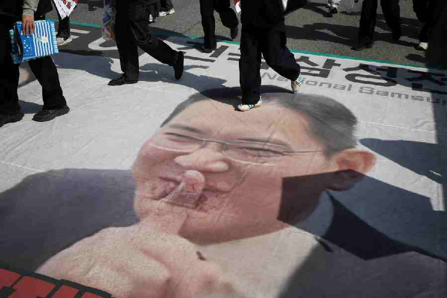Samsung Electronics’ labour union members step on a banner depicting Samsung Electronics Chairman Jay Y. Lee, as they leave after a protest against company’s compensation levels ahead of a planned lengthy strike in front of Samsung Electronics semiconductor plant in Pyeongtaek, South Korea, April 23, 2026. Reuters picture