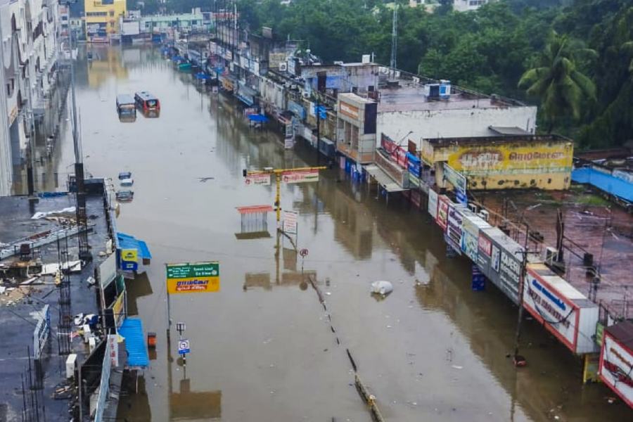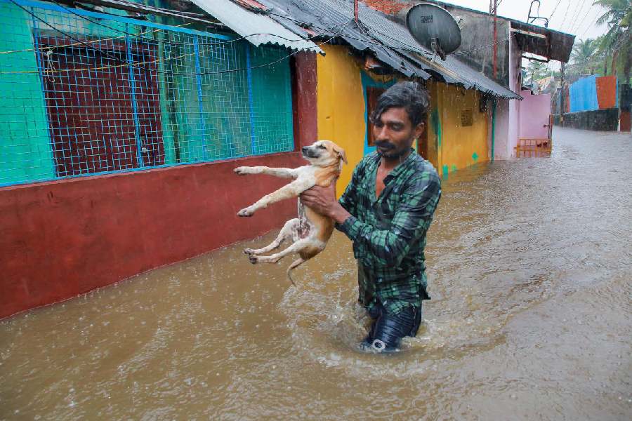 People shift to safe places from a flood-hit area following heavy rains, in Thoothkudi.