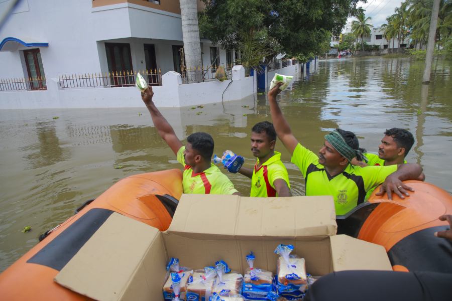Rescue workers provide water and other relief material to flood-hit people in Kanyakumari.