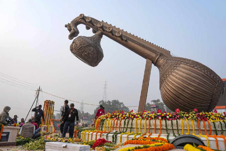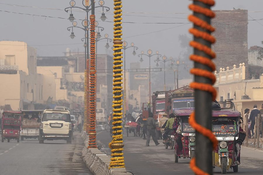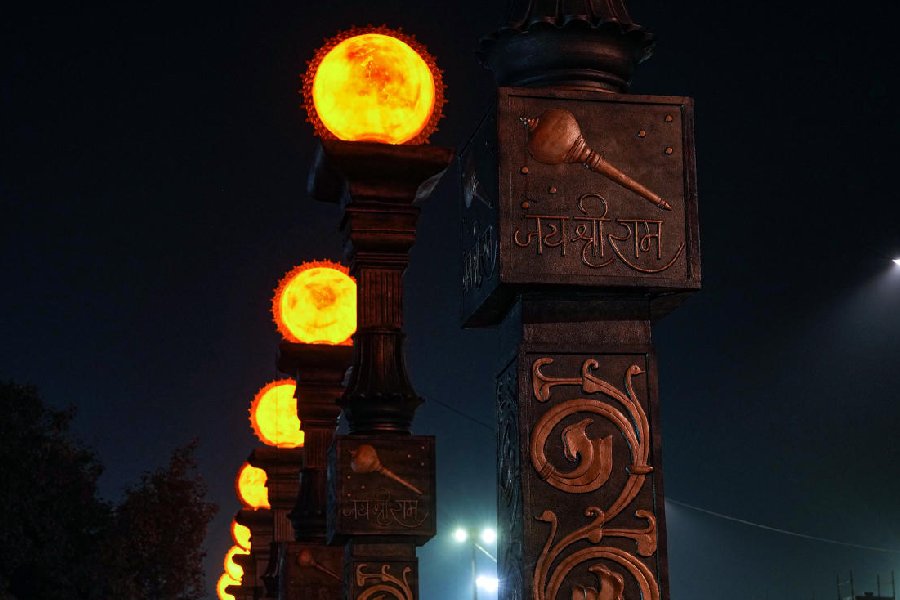 Sun-themed columns 'Surya Stambh' installed along the 'Dharma Path' ahead of the consecration of Shri Ram Janmabhoomi temple, near the Lata Mangeshkar Chowk.