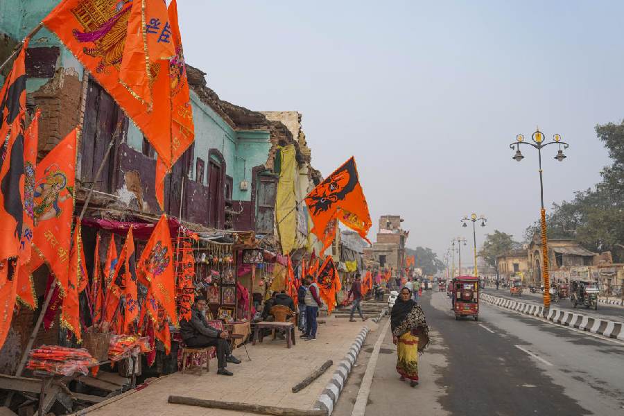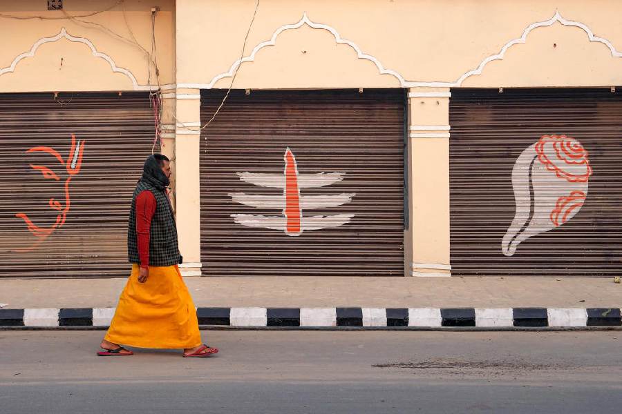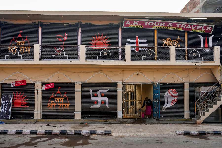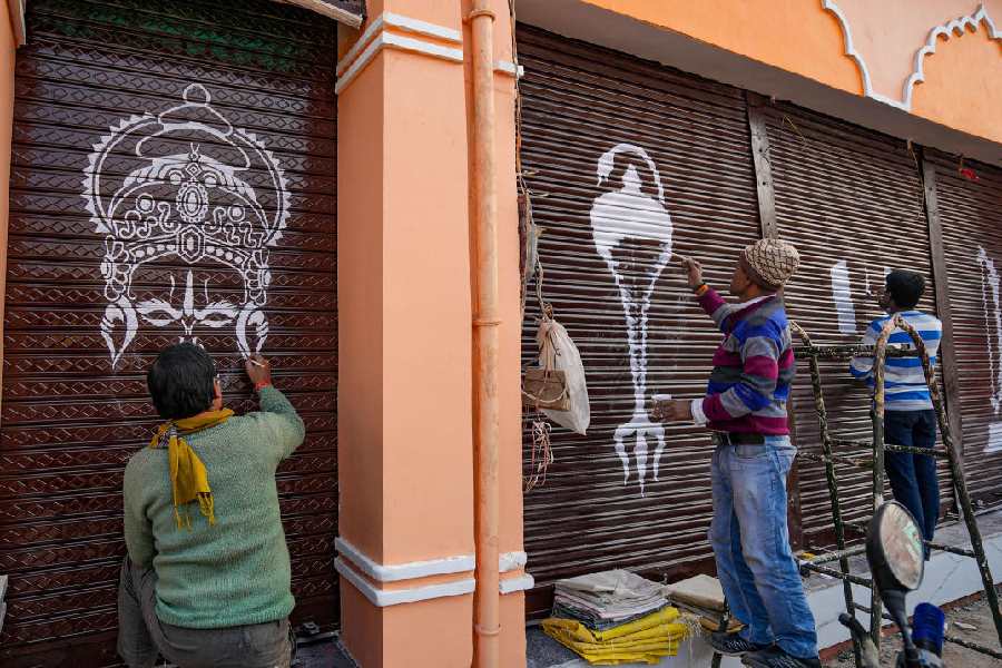 Shutters of shops along a road decorated with Hindu-theme artwork ahead of the consecration ceremony of the Lord Ram temple.