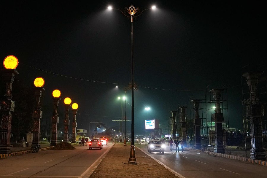 Workers decorate Lata Mangeshkar Chowk ahead of Prime Minister Narendra Modi's visit.