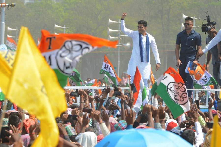 TMC National General Secretary Abhishek Banerjee during the rally. Claiming that "Modi ki guarantee" has "zero warranty", Abhishek Banerjee labelled BJP leaders as "outsiders and anti-Bengal", who only visit the state during elections.