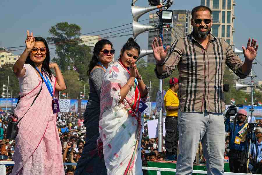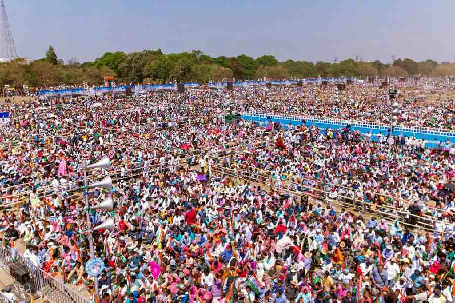 TMC chief and West Bengal Chief Minister Mamata Banerjee during a rally, ahead of the Lok Sabha elections, in Calcutta. Speaking at the mega rally of the TMC at Brigade Parade Grounds, Banerjee said the sudden resignation of Election Commissioner Arun Goel proves that the “BJP is attempting to loot votes in the Lok Sabha polls”.