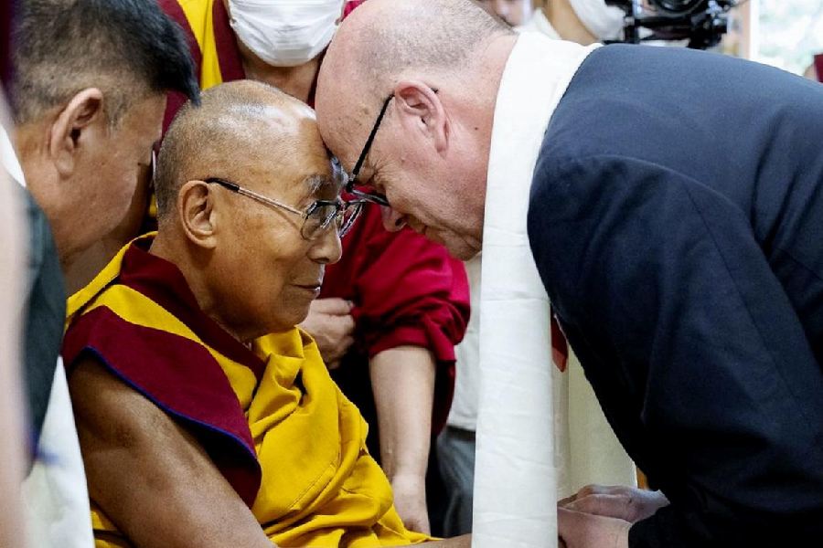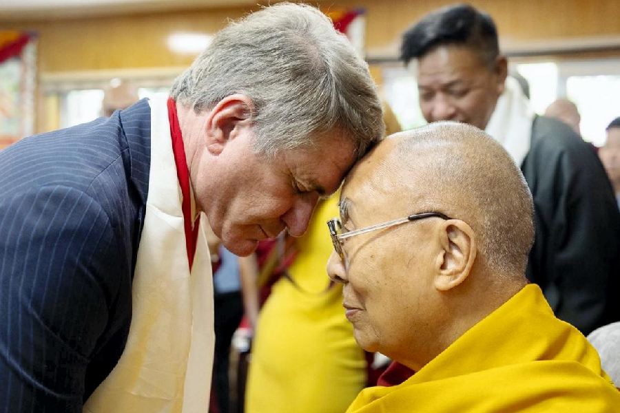 Tibetan spiritual leader Dalai Lama being greeted by US representative Jim McGovern during a meeting with US Congressional delegation at his residence, in Dharamsala, Wednesday, June 19, 2024. Beijing, predictably, has expressed serious concern over both the visit and the proposed legislation. China's government has long accused the Dalai Lama of being a dangerous 'splittist' and has repeatedly warned international leaders against engaging with him.
