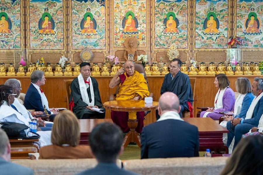 Tibetan spiritual leader Dalai Lama during a meeting with former US House of Representatives Speaker Nancy Pelosi and other US Congressional delegation at his residence, in Dharamsala, Wednesday, June 19, 2024. One of the key issues on the agenda for the lawmakers was a U.S. bill aimed at pressuring China to resolve the longstanding Tibet dispute. This bill, which is currently awaiting President Joe Biden's signature, signifies a renewed American focus on Tibetan rights and autonomy.