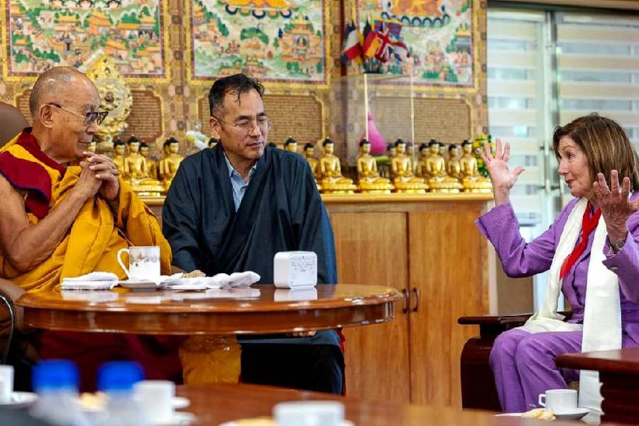 Tibetan spiritual leader Dalai Lama with former US House of Representatives Speaker Nancy Pelosi during a meeting with US Congressional delegation at his residence, in Dharamsala, Wednesday, June 19, 2024. The bipartisan delegation, consisting of seven prominent figures, met the 88-year-old Nobel Peace laureate at his monastery in the northern town of Dharamsala. Their arrival was met with an enthusiastic reception from local school children, Buddhist monks, and nuns, who welcomed the lawmakers.