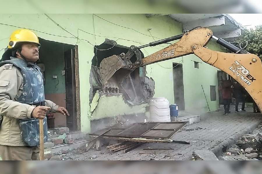 Heavy machinery being used to demolish the madrasa. Residents were seen breaking barricades and arguing with the police personnel engaged in the demolition exercise.