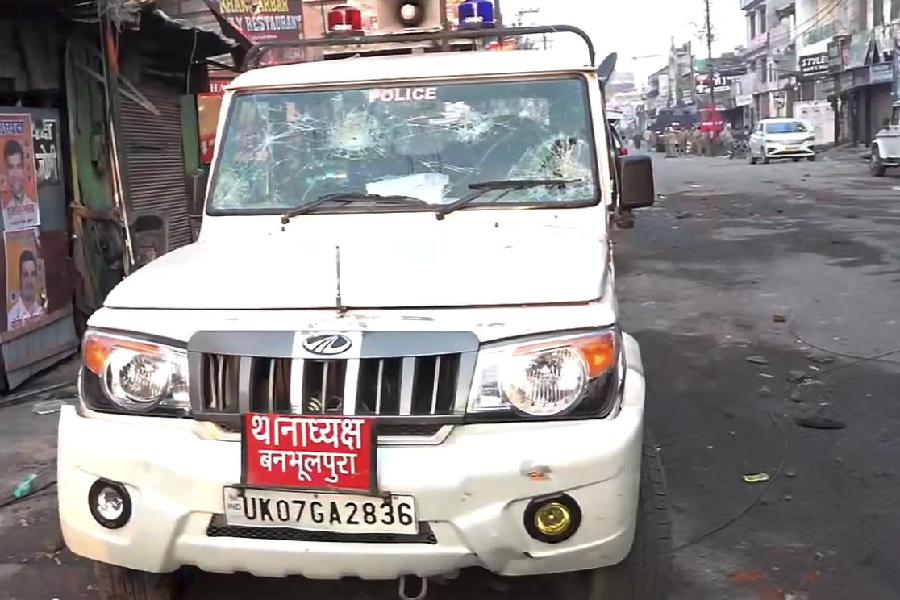 A damaged police van on a roadside after local residents set vehicles and a police station on fire and hurled stones. As the violence escalated, all the shops in Haldwani were closed.