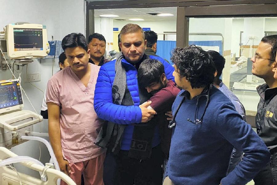 Haldwani MLA Sumit Hridayesh hugs a man during his visit to a hospital to see injured police officials.