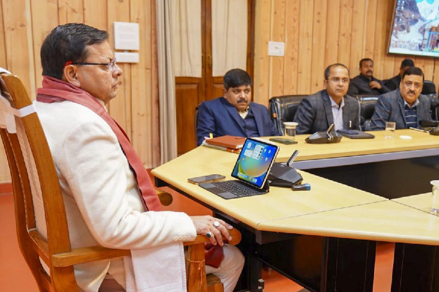 Uttarakhand Chief Minister Pushkar Singh Dhami during a meeting with officials regarding the recent violence that erupted in Haldwani.