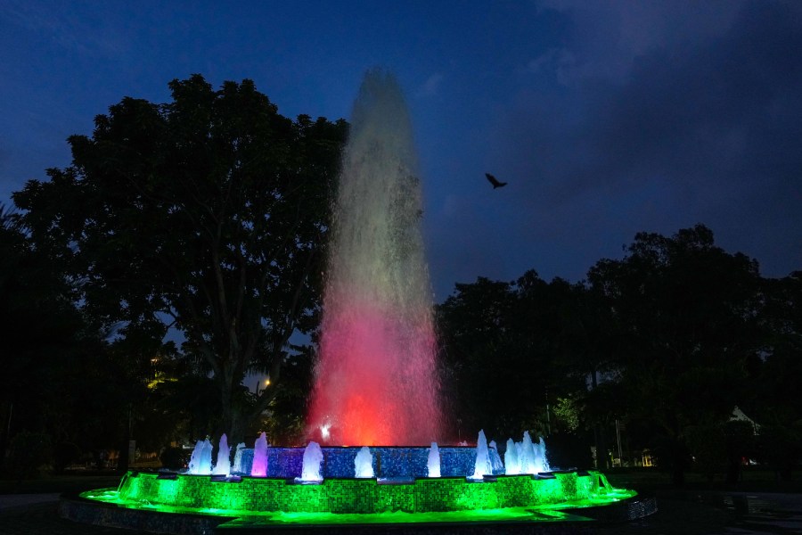 An illuminated fountain as part of preparations. Over 100 sculptures and 150 fountains with different designs have been installed to give Delhi an aesthetic look.