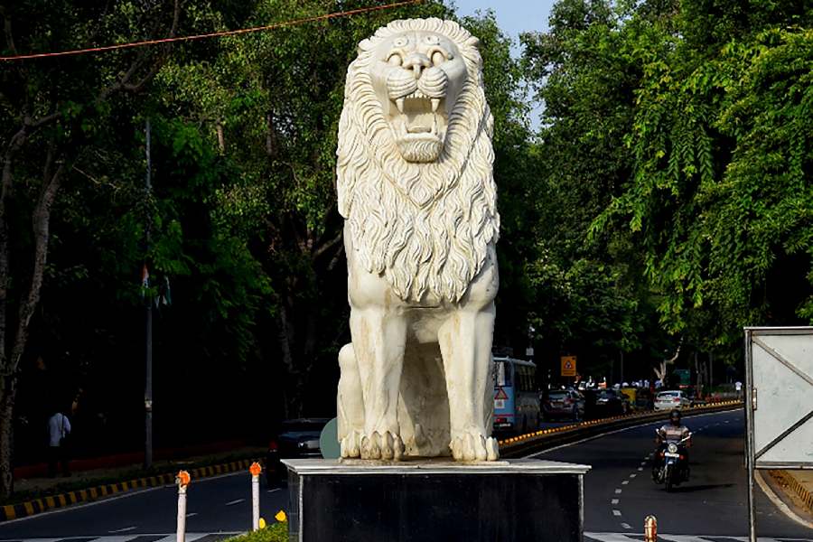 A stone-carved lion statue installed at Lok Kalyan Marg near Prime Minister's residence. Statues have been installed near Indira Gandhi International Airport as part of the G20 Summit preparations.