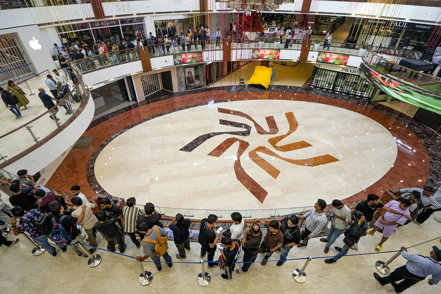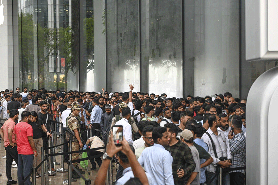 Customers wait in queues outside an Apple store to buy the company's newly-launched iPhone 17 series smartphones and other products as its sale begins, in Mumbai, Friday, Sept. 19, 2025.