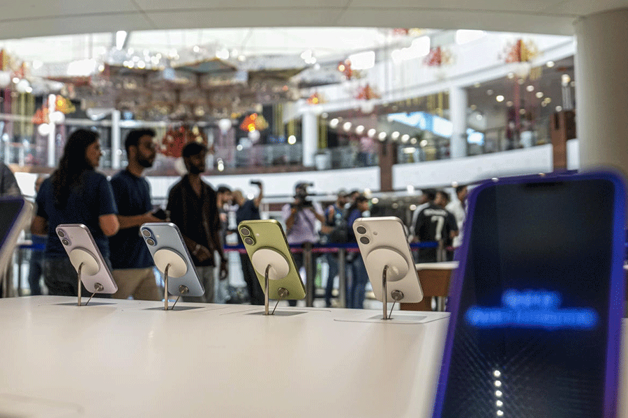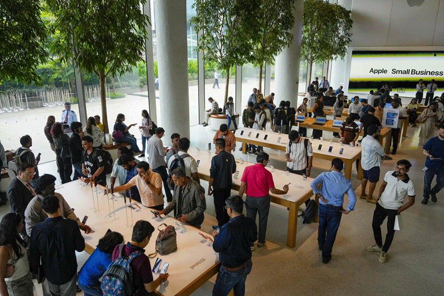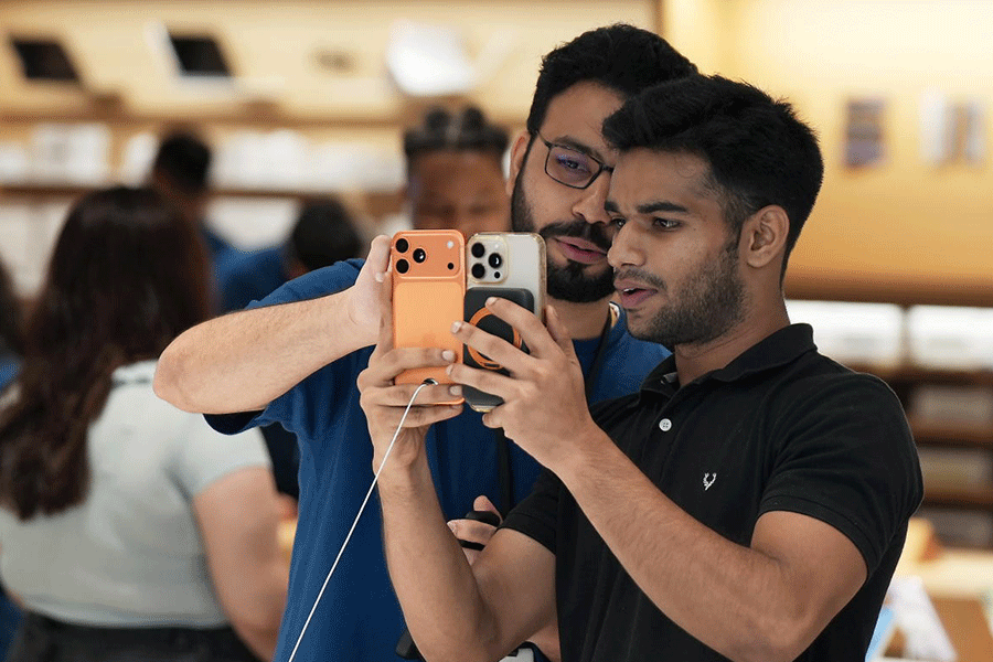 Customers check Apple’s newly-launched iPhone 17 series smartphones and other products as its sale begins, at the company’s store, in Mumbai, Friday, Sept. 19, 2025.