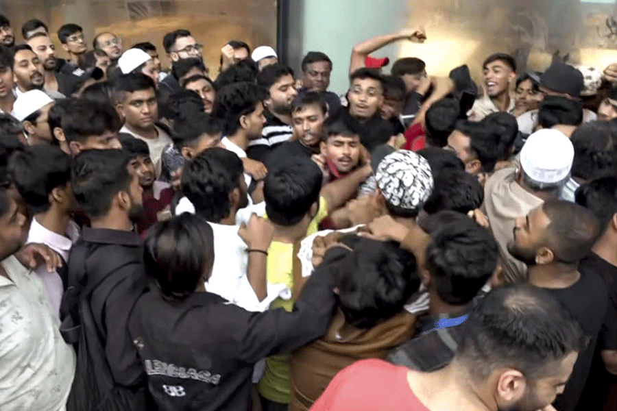 People react amid an altercation while queuing for Apple’s newly launched iPhone 17 series smartphones and other products at the company’s store in Bandra Kurla Complex (BKC), Mumbai, Friday, Sept. 19, 2025.