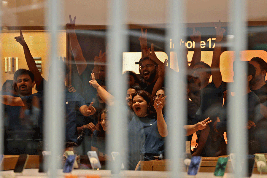 Employees react inside an Apple store ahead of the sale of the iPhone 17 series in New Delhi, India, September 19, 2025.