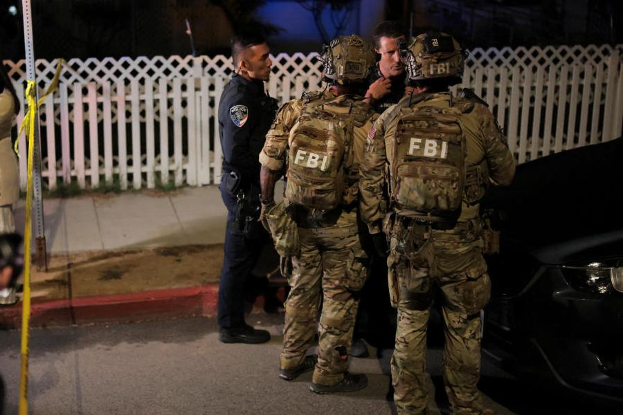 Police officers and FBI agents stand infront of the media gathered outside residence associated with Cole Tomas Allen, the suspect in the shooting incident at the annual White House Correspondents' Association dinner in Washington, D.C., in Torrance, California, U.S., April 25, 2026. (Reuters)