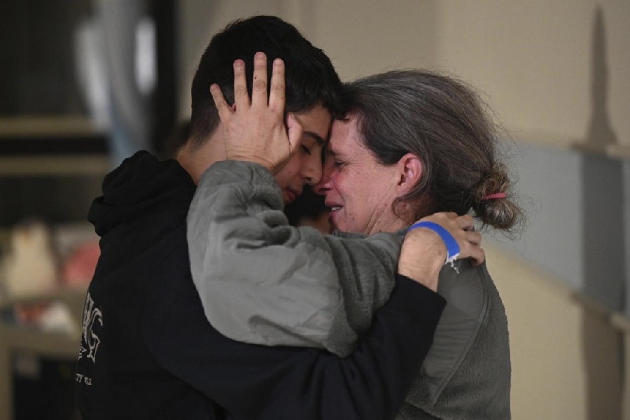 Sharon Hertzman, right, hugging a relative as they reunite at Sheba Medical Center in Ramat Gan, Israel. Hertzman and her daughter Noam, 12 years old, not pictured, were released by Hamas after being held as hostages in Gaza for 50 days.