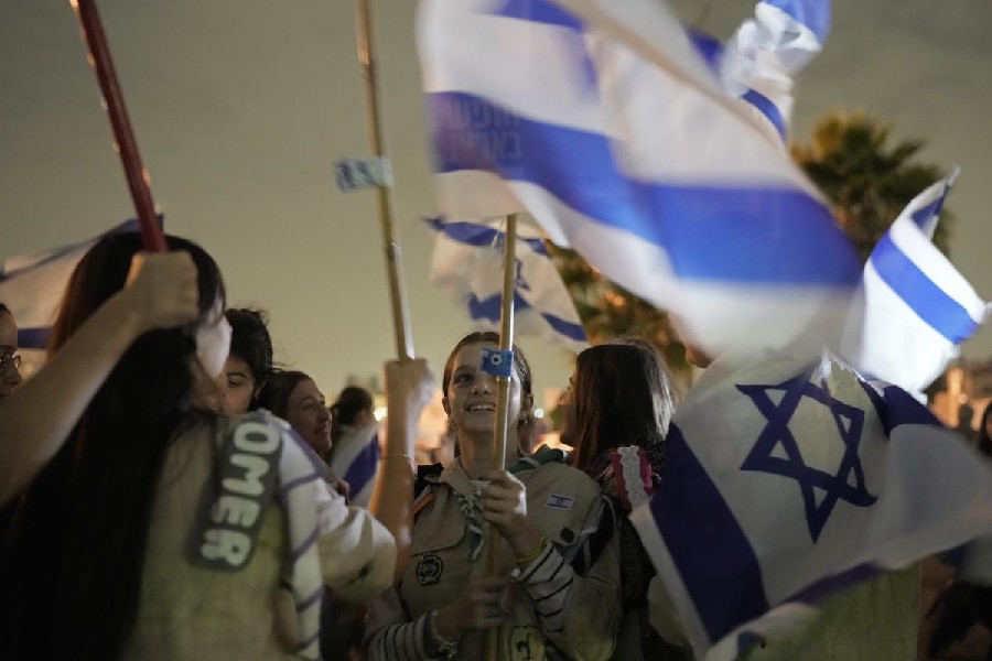 A group of young Israeli scouts celebrate as they wait the arrival of the newly released hostages from the Gaza Strip, near the helipad of the Schneider Children's Medical Center in Petah Tikva, Israel.
