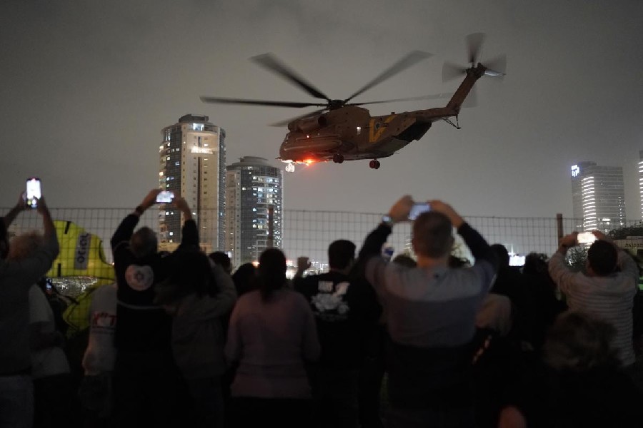 A group of Israelis watch as a helicopter carrying hostages released from the Gaza Strip lands at the helipad of the Schneider Children's Medical Center in Petah Tikva, Israel, on November 26. The cease-fire between Israel and Hamas was back on track as the militants freed 17 more hostages, including 14 Israelis and the first American, in exchange for 39 Palestinian prisoners in a third set of releases under a four-day truce.