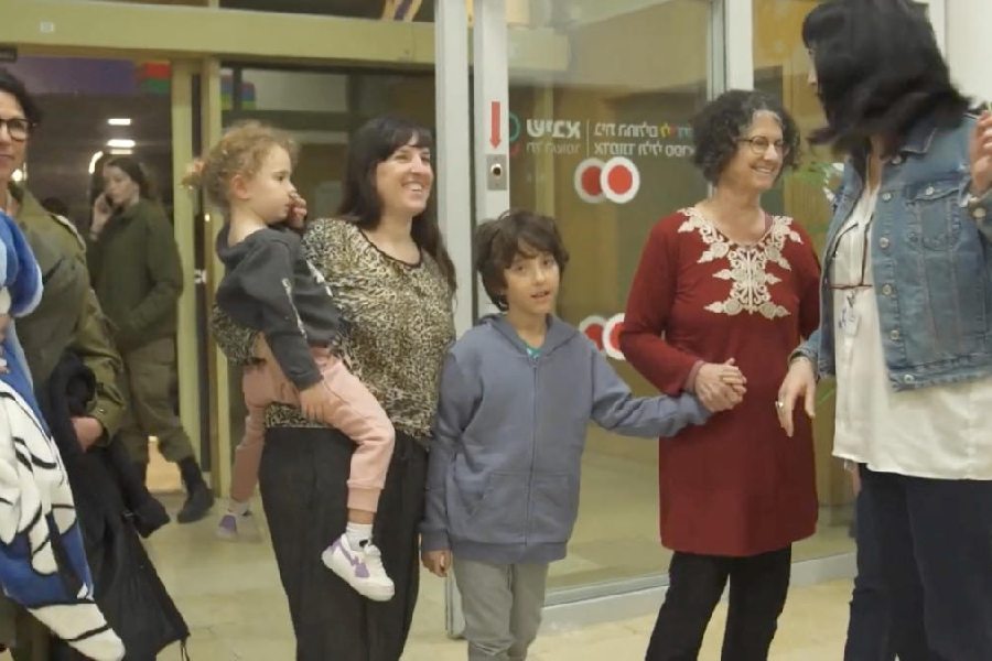 Adi Shoham, 38, her children Yahel Shoham, 3, and Nave Shoham, 8, and Shoshan Haran, released Israeli hostages, walk following their arrival in Israel on November 25 after being held hostage by the Palestinian militant group Hamas in the Gaza Strip, at an unknown location in Israel.