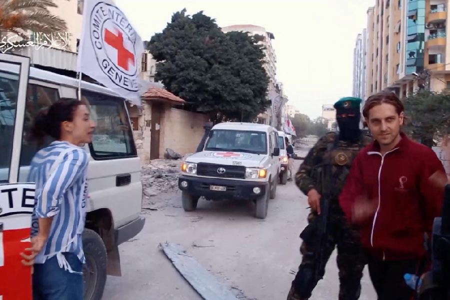 Hostage Roni Krivoi, 25, who was abducted by Hamas gunmen during the October 7 attack on Israel, is handed over by Hamas militants to members of the International Committee of the Red Cross.