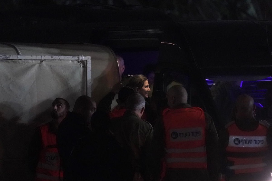 Released hostages get-off a helicopter after being released from Gaza by Hamas at the helipad of the Schneider Children's Medical Center in Petah Tikva, Israel.