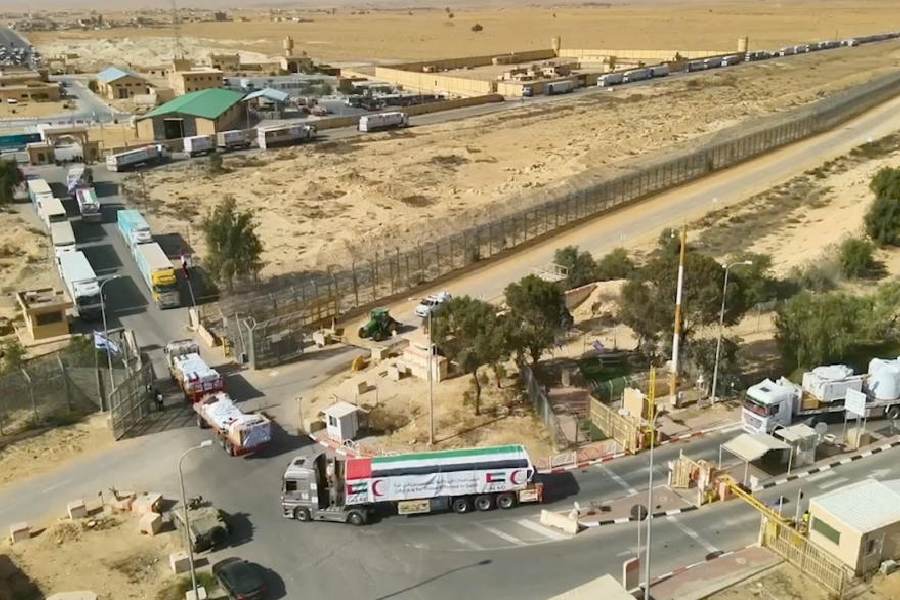 View of what the Israeli military says are trucks carrying humanitarian aid being transported to Gaza, during a temporary truce between Israel and Palestinian Islamist group Hamas, at a location given as the Border of Nitzana Crossing.