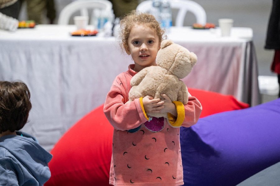 Yahel Shoham, 3, a released Israeli hostage, holds a cuddly toy shortly after her arrival in Israel on November 25.