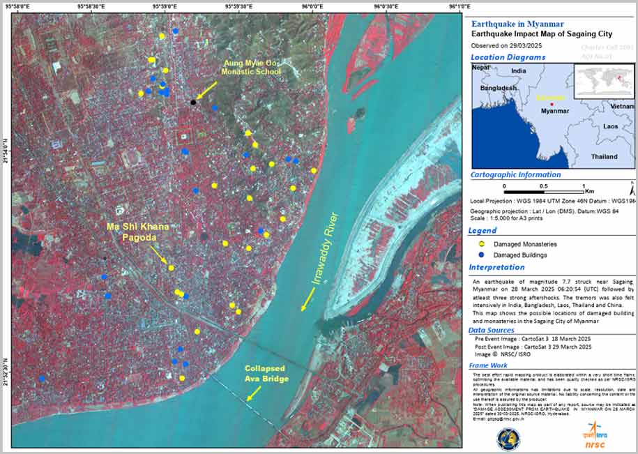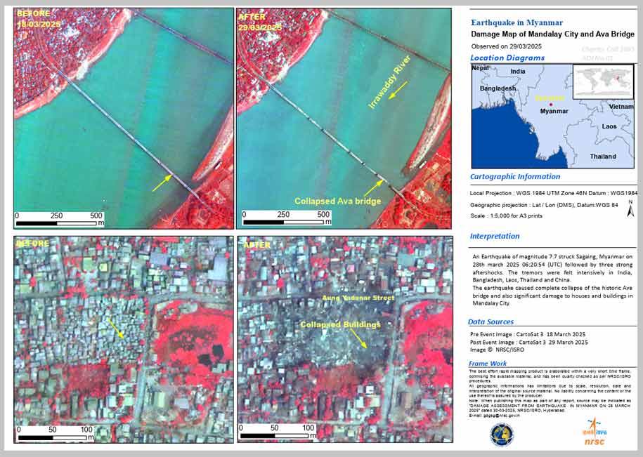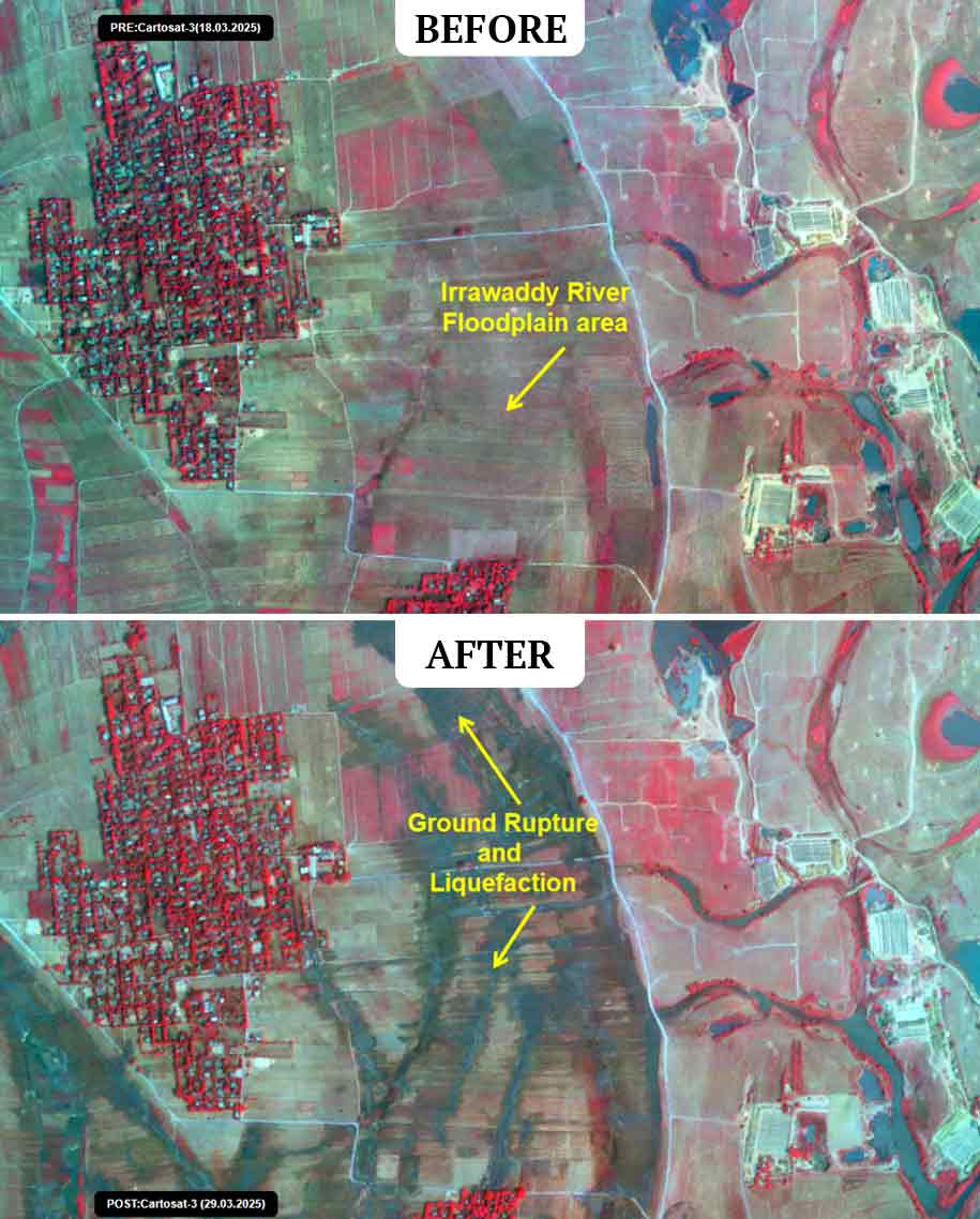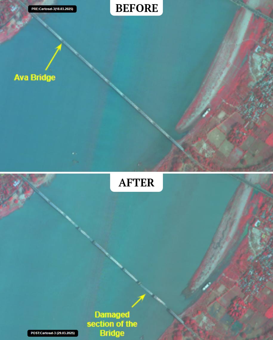 According to ISRO, as seen from the imagery, the earthquake caused the complete collapse of the historic Ava (InnWa) Bridge on the Irrawaddy River near Inn Wa City. Cracks, ground ruptures in flood plains of Irrawaddy river with associated liquefaction was also observed.