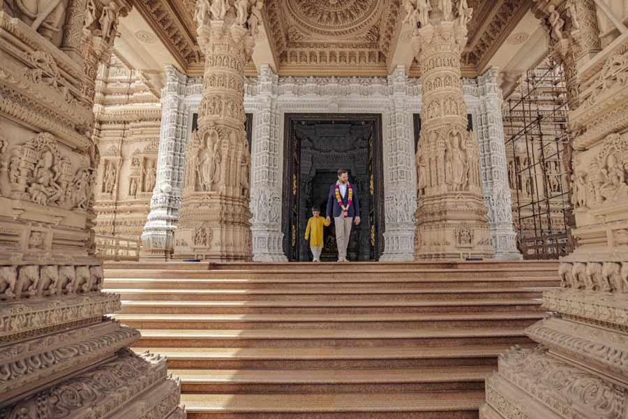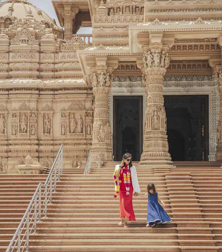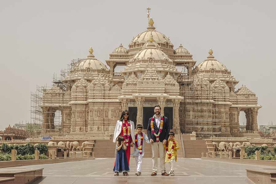 The Vance family visited the Akshardham temple where they posed for camera crews outside the shrine's imposing facade.