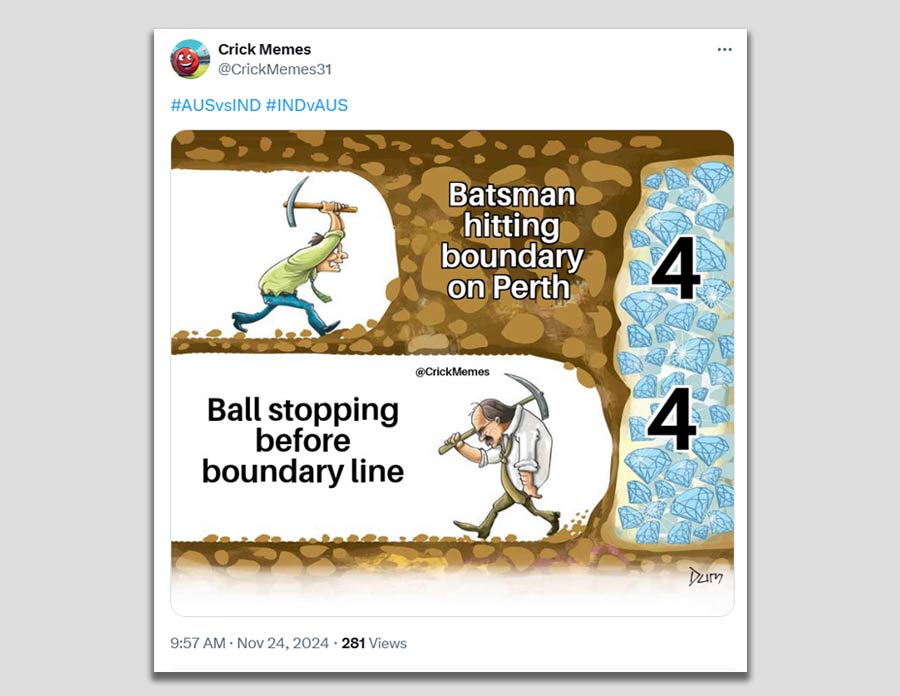 One meme depicted a popular game where a digger digs for diamonds, captioned with “Batsman hitting boundary on Perth”. The change? The ball stops just below the boundary line, signalling only a four instead of a six. This shows the challenges batsmen faced on the Perth pitch, where big hits couldn’t always clear the boundary.