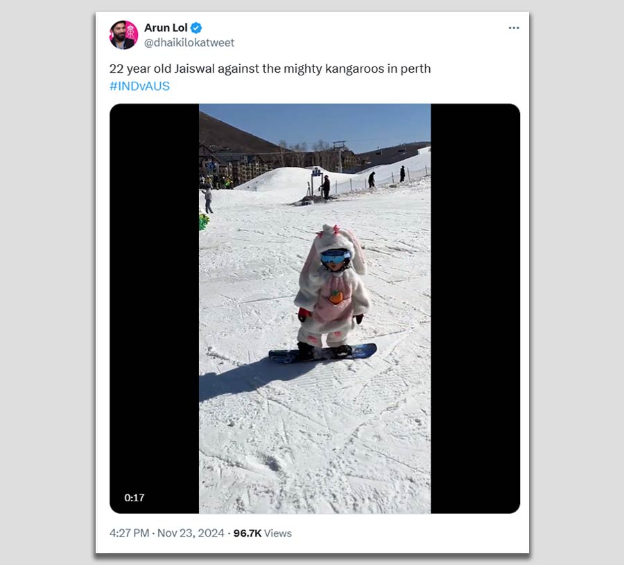 A video showing a child skiing and then speeding up was captioned: “22-year-old Jaiswal against the mighty kangaroos in Perth.” The meme compares with Jaiswal’s innings, where he started cautiously but later unleashed a fury on the Aussie bowlers. With his century, the young cricketer made the “kangaroos” nervous.