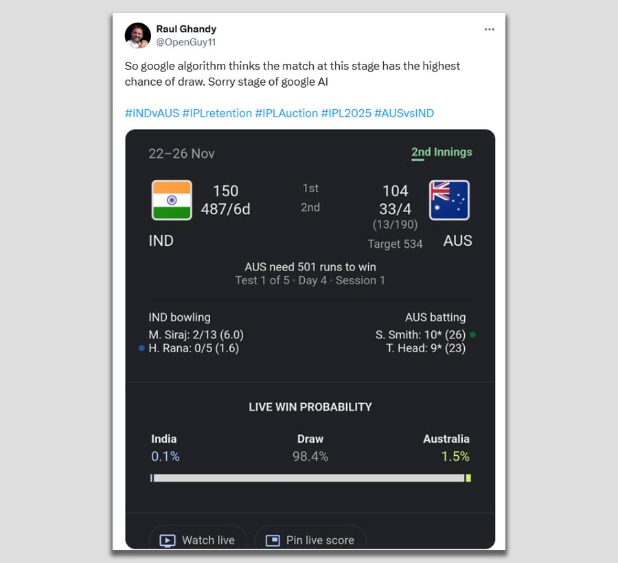 A fan shared a screenshot of Google’s match algorithm predicting a draw during the game, writing: “Sorry, stage of Google AI.” With India’s lead and Australia already crumbling, the meme showcases how AI couldn’t foresee the inevitable Indian victory in the making.