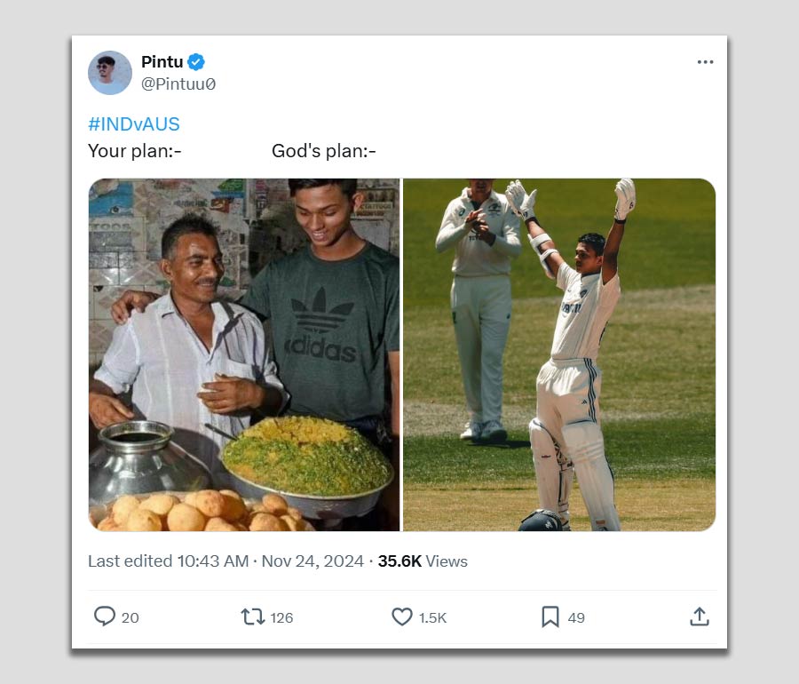 A viral image showed Yashasvi Jaiswal outside a pani puri stall, captioned: “Your plan,” while the other side of the image showed him raising his bat after scoring a century, captioned: “God’s plan.” This meme celebrates Jaiswal’s journey from humble beginnings to scoring a century in Perth, being a blend of inspiration and humour.