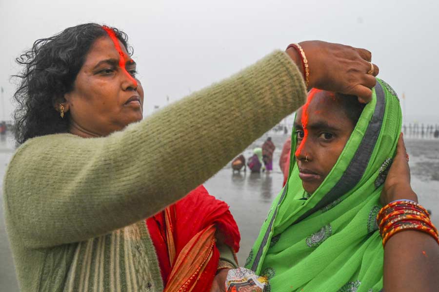 Devotees offer vermillion to each other after taking a holy dip on the occasion of 'Makar Sankranti' festival, during the ongoing Gangasagar Mela 2025, at Sagar Island, in South 24 Parganas district, West Bengal, Tuesday, Jan. 14, 2025. (PTI)