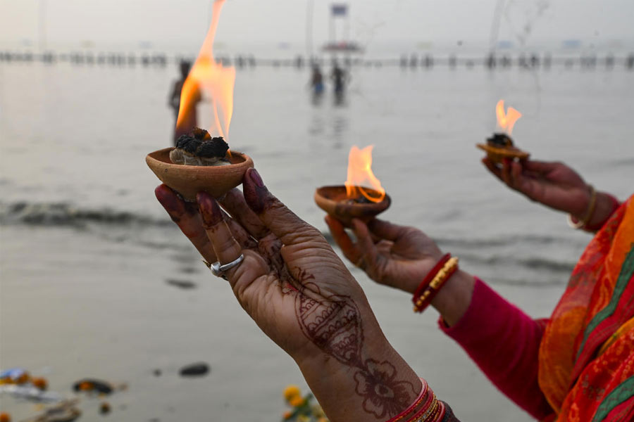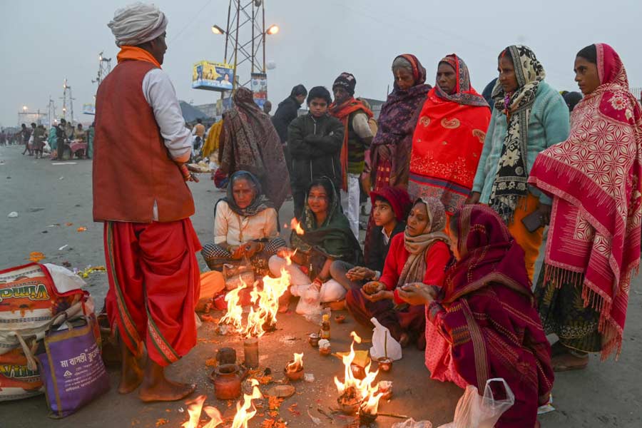 Devotees perform rituals after taking a holy dip in the Ganga river on the occasion of 'Makar Sankranti' festival, during the ongoing Gangasagar Mela 2025, at Sagar Island, in South 24 Parganas district, West Bengal, Tuesday, Jan. 14, 2025. (PTI)
