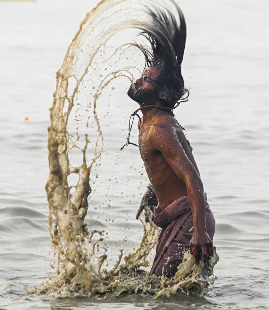 A 'sadhu' takes a holy dip in the Ganga river on the occasion of 'Makar Sankranti' festival, during the ongoing Gangasagar Mela 2025, at Sagar Island, in South 24 Parganas district, West Bengal, Tuesday, Jan. 14, 2025. (PTI)
