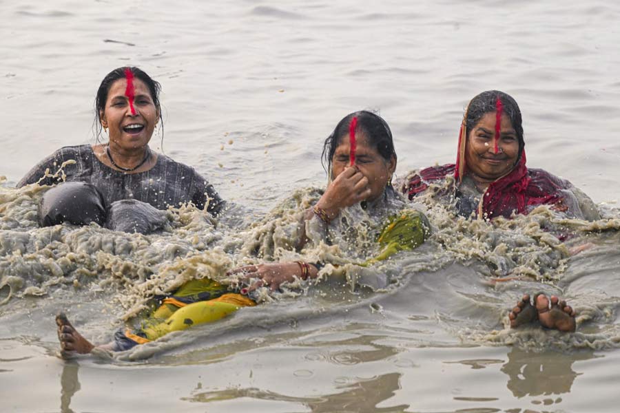 Devotees take a holy dip in the Ganga river on the occasion of 'Makar Sankranti' festival, during the ongoing Gangasagar Mela 2025, at Sagar Island, in South 24 Parganas district, West Bengal, Tuesday, Jan. 14, 2025. (PTI)