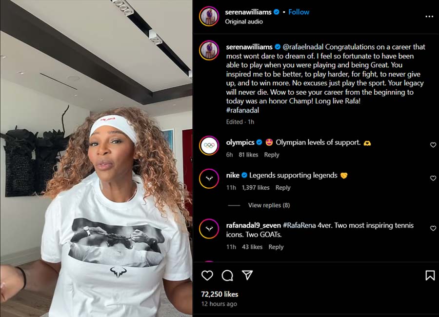 "Congratulations on a career that most won't dare to dream of," Williams said on Instagram alongside a video of her wearing Nadal-branded merchandise.