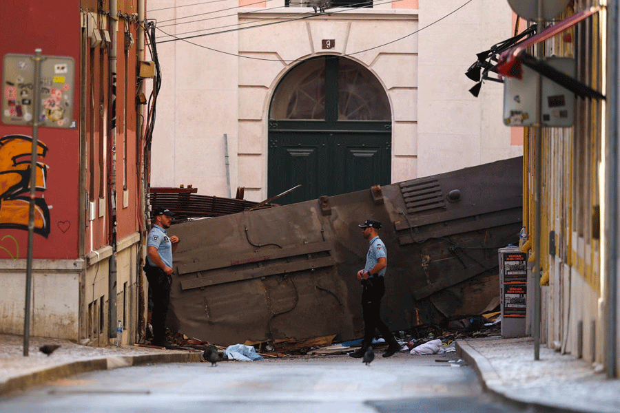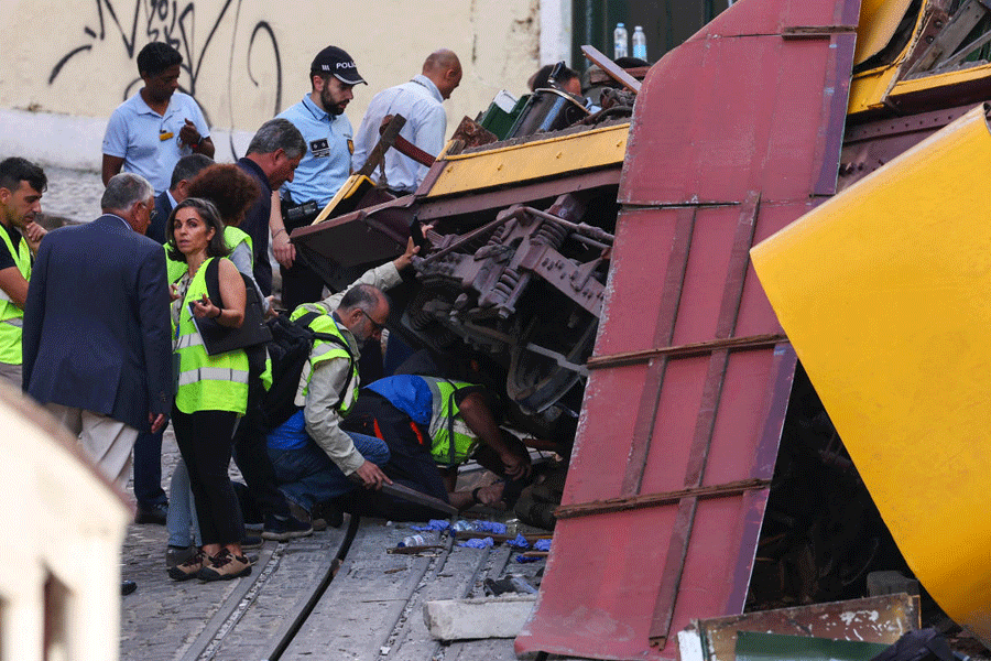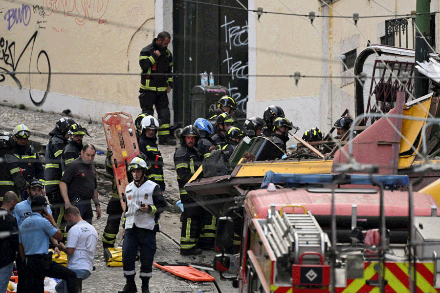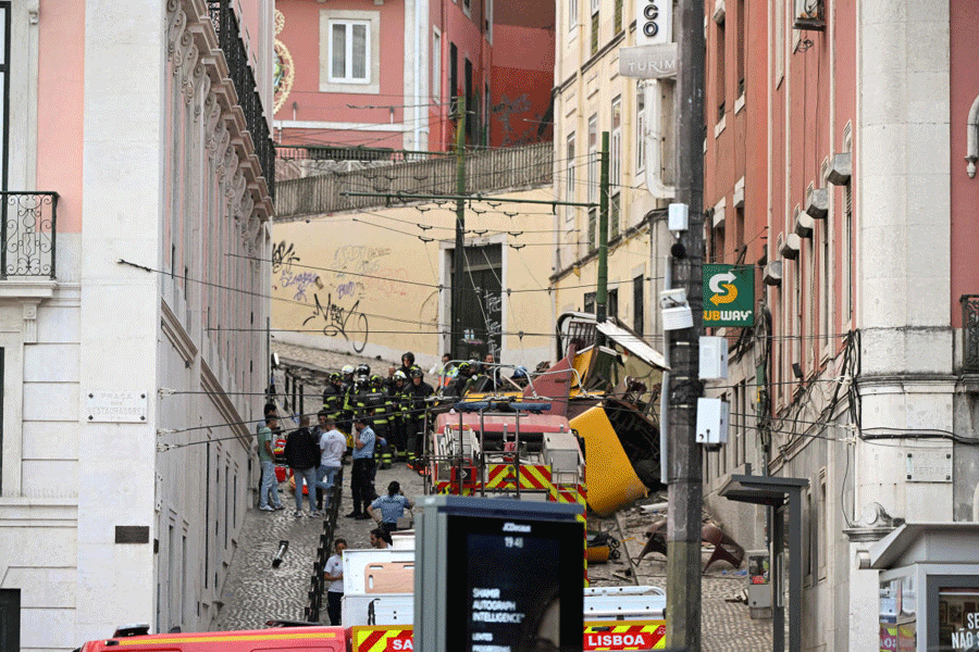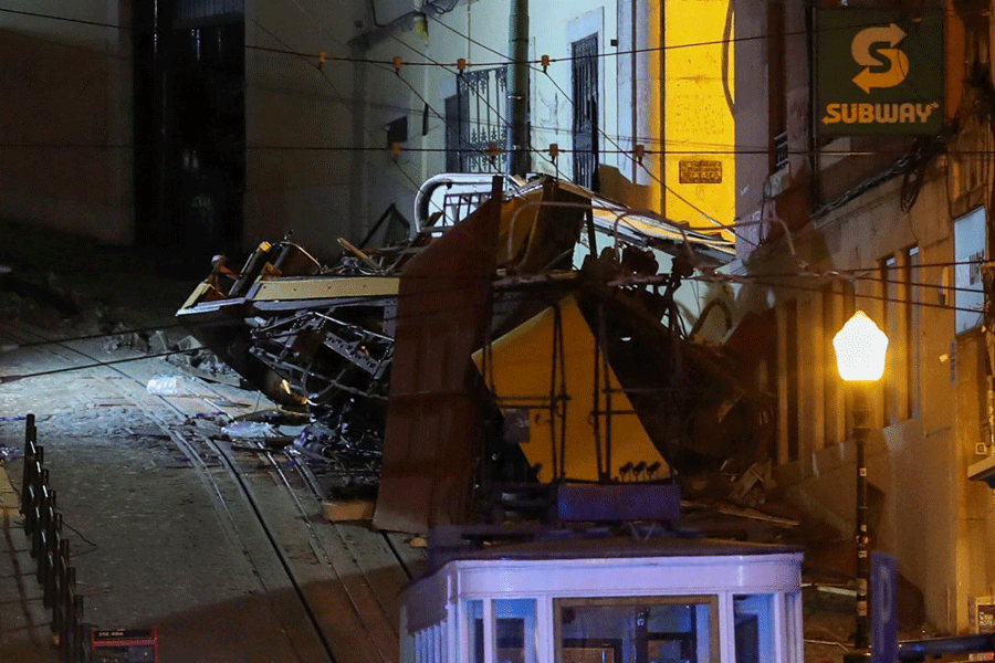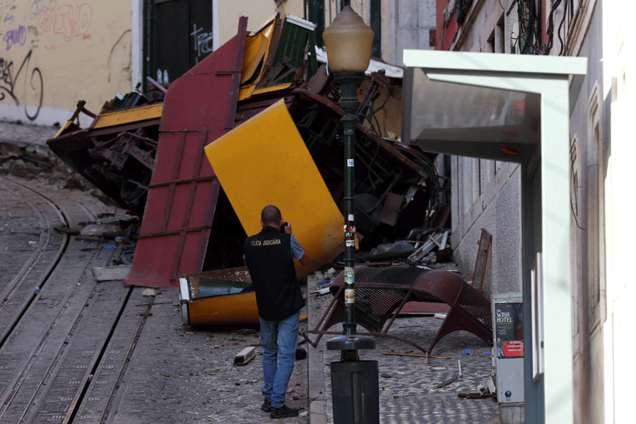 Footage from the site showed the mangled wreckage of the yellow tram-like funicular, which carries people up and down a steep hillside in the Portuguese capital, lying where it had left the track and hit a building, just metres from another car at the bottom of the hill.