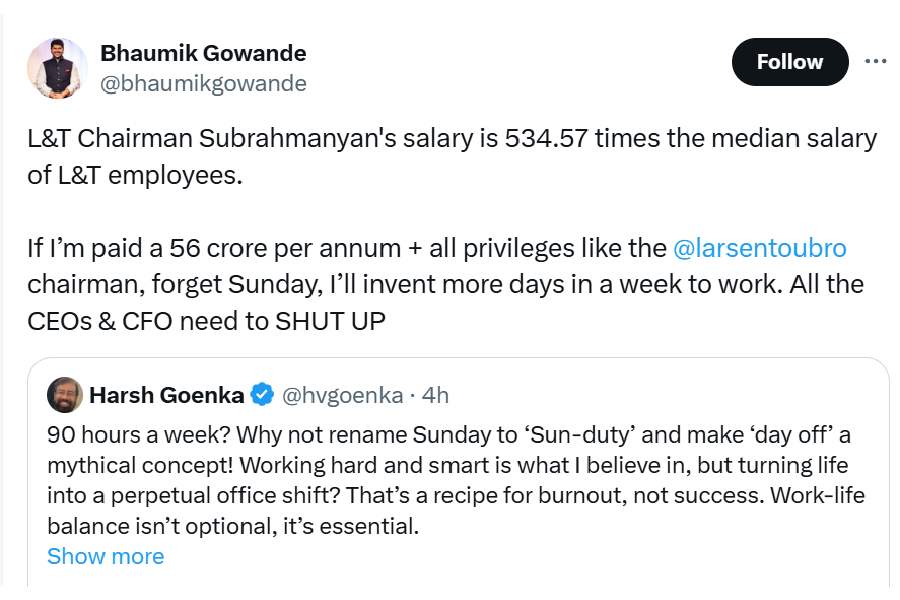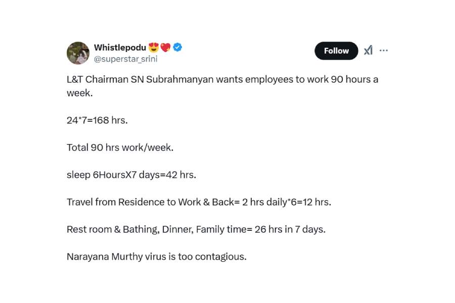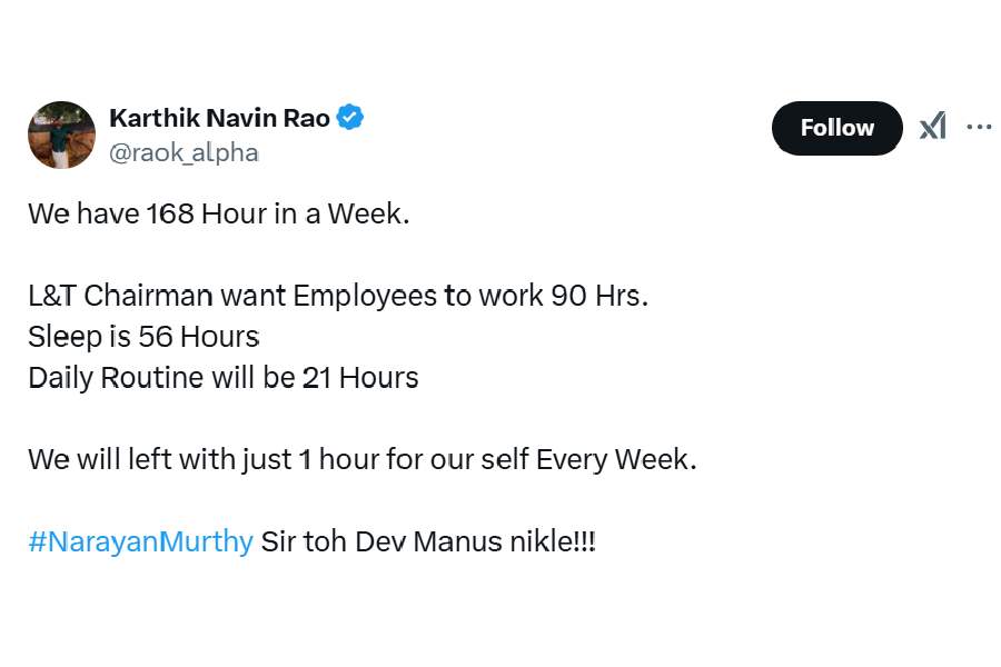One user did the maths and broke down Subrahmanyan’s proposed schedule: “90 hours work, 42 hours sleep, 26 hours for basic needs, 12 hours commute… leaves 1 hour for life. Narayana Murthy virus is too contagious!”