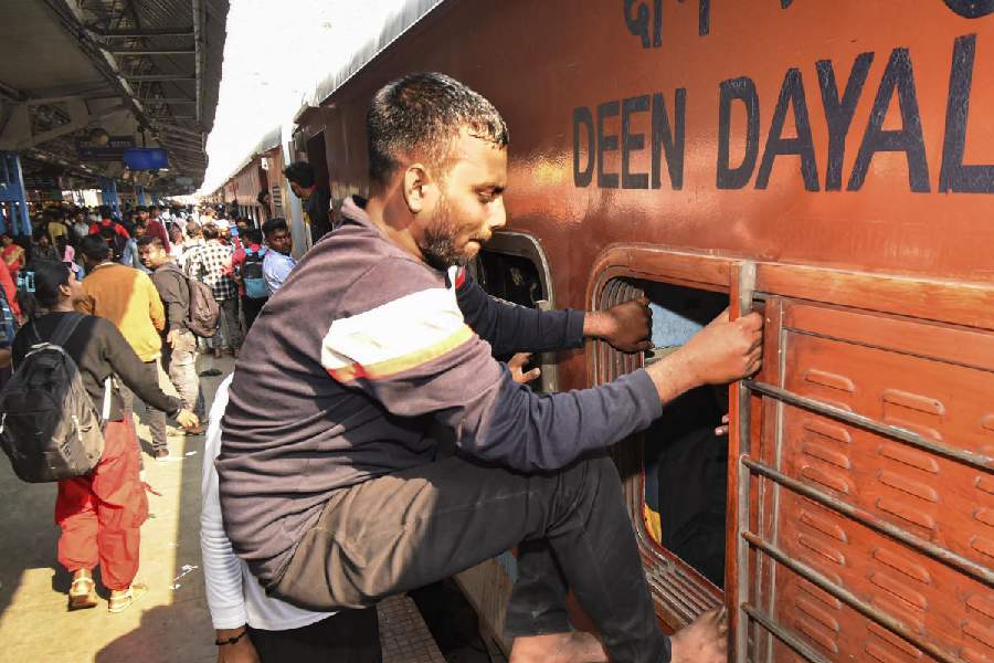 A passenger tries to enter a train through an emergency window amid rush owing to the ongoing Prayagraj's Mahakumbh Mela, at Patna railway station, Wednesday, Feb. 19, 2025.