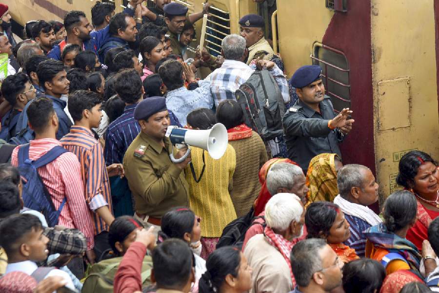 A security personnel makes announcements to manage the rush of passengers as they jostle to board a train amid rush owing to the ongoing Prayagraj's Mahakumbh Mela, at Patna railway station, Wednesday, Feb. 19, 2025.